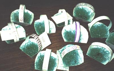 Diseñar y fabricar envases sin tapa superior, usando cartulina, que tengan la forma de pirámides truncadas invertidas, y que tengan como base un polígono regular (de su elección). Luego se añaden asas a estos envases, obteniendo así cestas de dulces interesantes y divertidas.