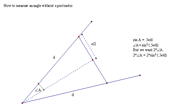 In an isosceles triangle, the height bisects its base, and also it bisects the angle opposite to it. So the top half of the triangle shown above is a right triangle with hypotenuse d and leg e/2. The sine of angle A, is sin(A) = .5e/d. But A is one half of the angle we have to measure, and therefore, the angle = 2*arcsin(0.5e/d).