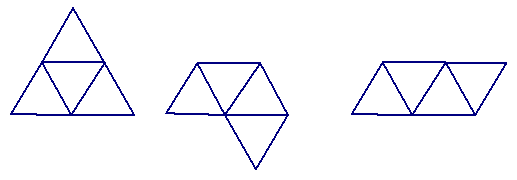 For each whole number n from one to ten, draw a net of n equilateral triangles with sides one inch long. and cut it out from an index card, cardstock, or poster board. For the numbers 1, 2, and 3 there is only one such net. For the number 4 there are three nets. Can you draw all nets for the numbers 5 and 6? Be original and decorate your nets.