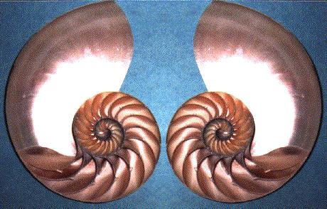 IntroductionThe shell of the nautilus looks similar to the shells of some snails, but the nautilus is a relative of squids and octopuses. Its shell is divided into chambers, and the animal always lives in the biggest chamber in the front. But the other chambers are also important because the nautilus uses them to control its buoyancy, and it either hovers close to the surface or goes deep down toward the bottom of the ocean. Activity Students will create sets of similar triangles which, fixed together with a piece of Scotch tape, form a spiral-like, segmented shape, slightly similar to the cross section of the shell of a nautilus. Calculations: simple scientific calculator (for example TI-30Xa) Part I. Basic Procedure [ top ] 1. Take a right triangle and cut it along its height into two similar right triangles. Keep the smaller triangle. Take the bigger triangle and repeat this procedure. 2. The longer leg of one of these triangles is equal to the hypotenuse of the next one, so if they are joined together in a way that the smallest angles of both triangles are adjecent, the configuration starts forming a "spiral". 3. To keep the triangle pieces together, it is usually enough to have one small square of Scotch tape (0.5 X 0.5 inches) in the center. 4. In order for the spiral to close nicely, 360 degrees must be a whole multiple of the smallest angle B of the triangle (see diagram). Thus B = 360/n for some whole number n. The smaller (or smaller or equal) of two acute angles of a right triangle has at most 45 degrees; so therefore n must be at least 8 since 360 degrees/8 = 45 degrees. You cannot make a chambered nautilus with less than 8 triangles. For a given n, the basic procedure is repeated n times, yielding n usable triangles and one small "tail" triangle to be discarded.