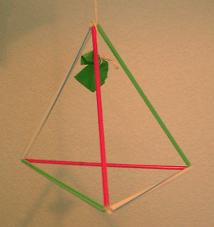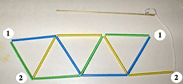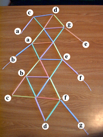 Threading is easy, but even small objects, such as tetrahedra, require a long piece of twine. Every polyhedron (or net) can be fixed together by one long strand of twine, and we do not know any reasonable design for which we would recommend more than three strands. But a long strand of twine gets twisted and tangled. So you have to constantly remember to untangle the "needle end" of the twine before threading it through the next straw. Also tie a small piece of paper or a small light object to the other end of the twine to prevent it from slipping into a straw. But the main difficulties are conceptual. Threading the twine to put a polyhedron together can be done in many different ways, but it is not arbitrary, so planning is important. But even if you make a good plan, what you see in front of you is a pile of straws, and you have to visualize the object you are making. This is very difficult for all children and for most adults. In order to overcome this difficulty, which can make the task impossible, you need teamwork.