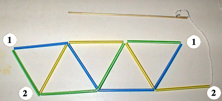 Make a triangle with three straws of different colors, threading it twice. Leave approximately one foot of a single strand outside for hanging it for display.