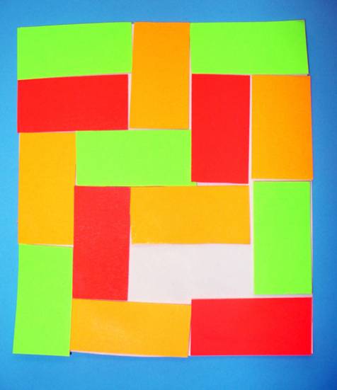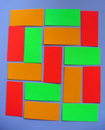To model the situation, cut from colored posterboard 15 rectangles (each 1 by 2 inches), five of each of three different colors. Then find a required pattern. These pieces can be put together to form a 5 by 6 rectangle.