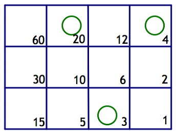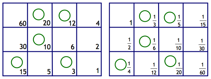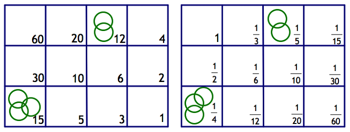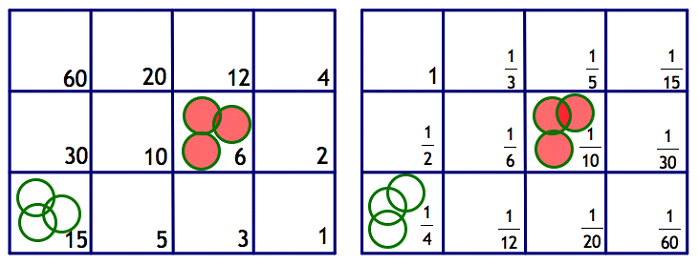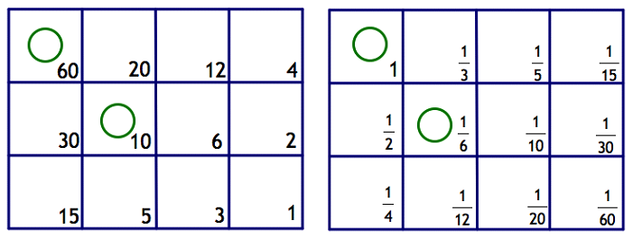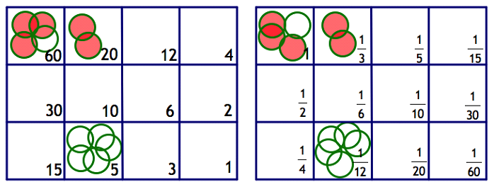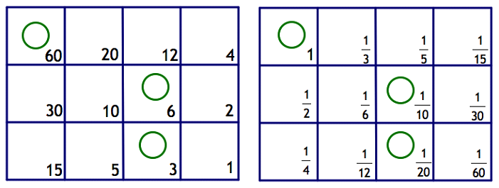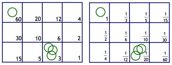Notice that dividing each number on the whole number board by 60 yields the corresponding fraction on the fraction board.