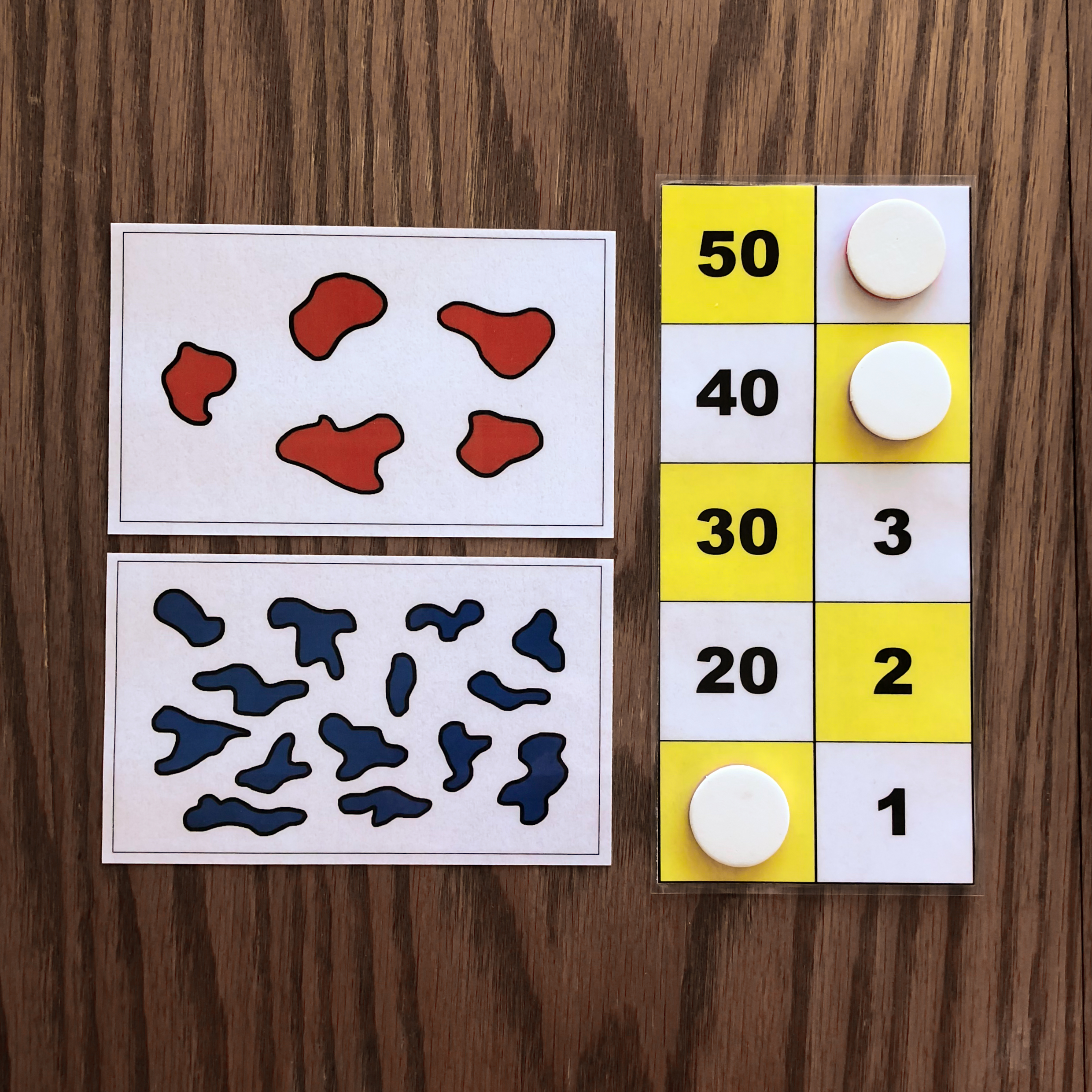 When given the first card, the child will represent the number on the board using tokens. In this example, the first card has 5 dots, so the child