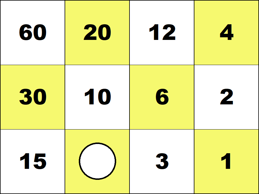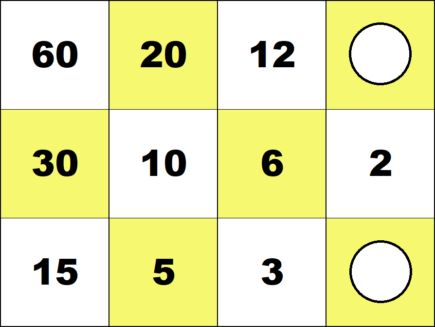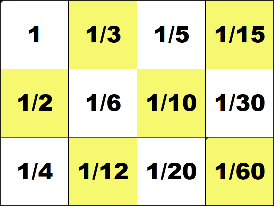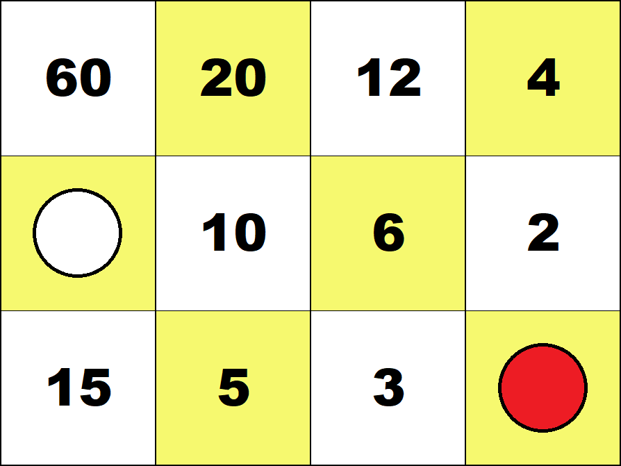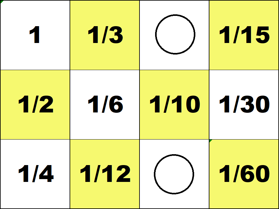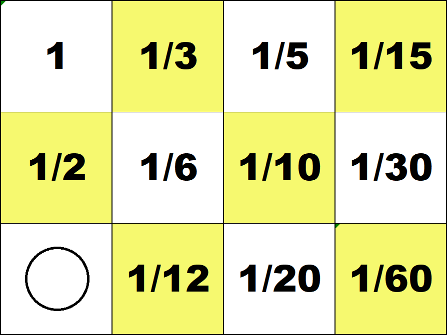 Represent all numbers from 1 to 100 with the smallest possible number of counters on the 3 by 4 integer board. (Use both white and red counters.) ![]() 29 = 30 - 1 ![]() 87 = 60 + 30 - 3 Represent all fractions 1/60, 2/60, ..., 59/60 with the smallest possible number of counters on the 3 by 4 fraction board. (Use both white and red counters.) ![]() 19/60 = 1/3 - 1/60 ![]() 51/60 = 1 - 1/10 - 1/20 Number Board index |