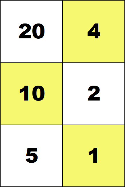 ![]() Using different counting boards can be confusing because two rules of regrouping, 5 = 4 + 1 and 3 = 2 + 1, are used together on both of the 3 by 4 boards.