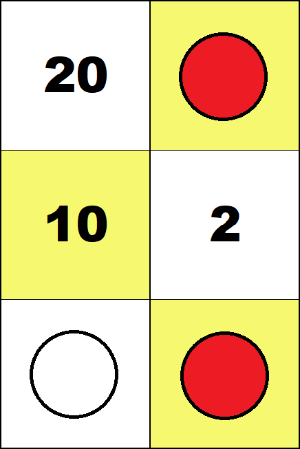 Working with these boards is not essential for learning any specific arithmetic algorithm. But it provides the opportunity to get familiar with individual whole numbers up to one hundred and some small fractions. (Such knowledge is commonly called "number sense".) The logical structure of arithmetic requires that such activities include using negative numbers. So in all activities, red counters must be used only for negative numbers, and white counters only for positive numbers. Activities For the Four Small Boards In all activities below students may put only one counter on each square. Task 1 Find all configurations representing zero on the 2 by 2 and 3 by 2 boards.