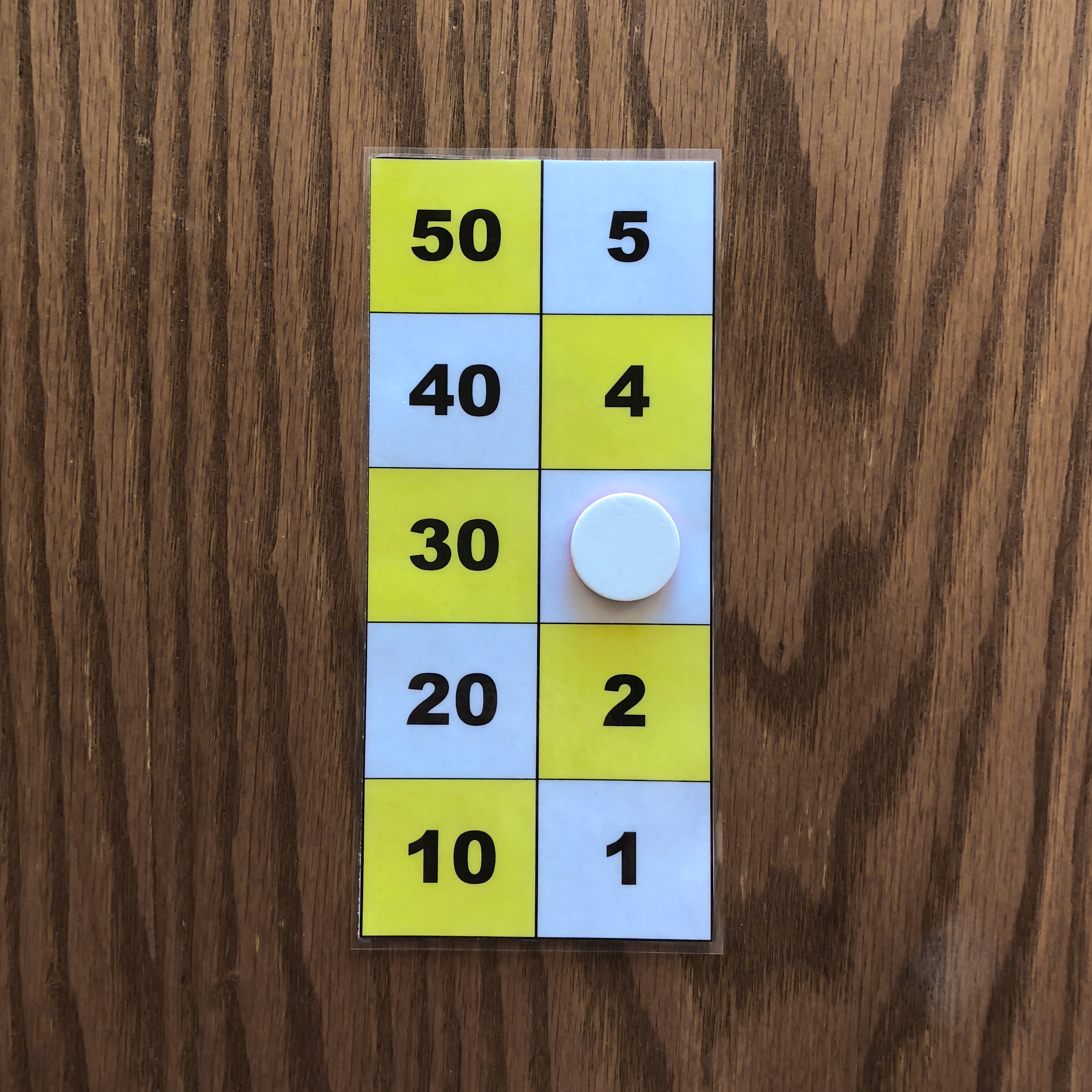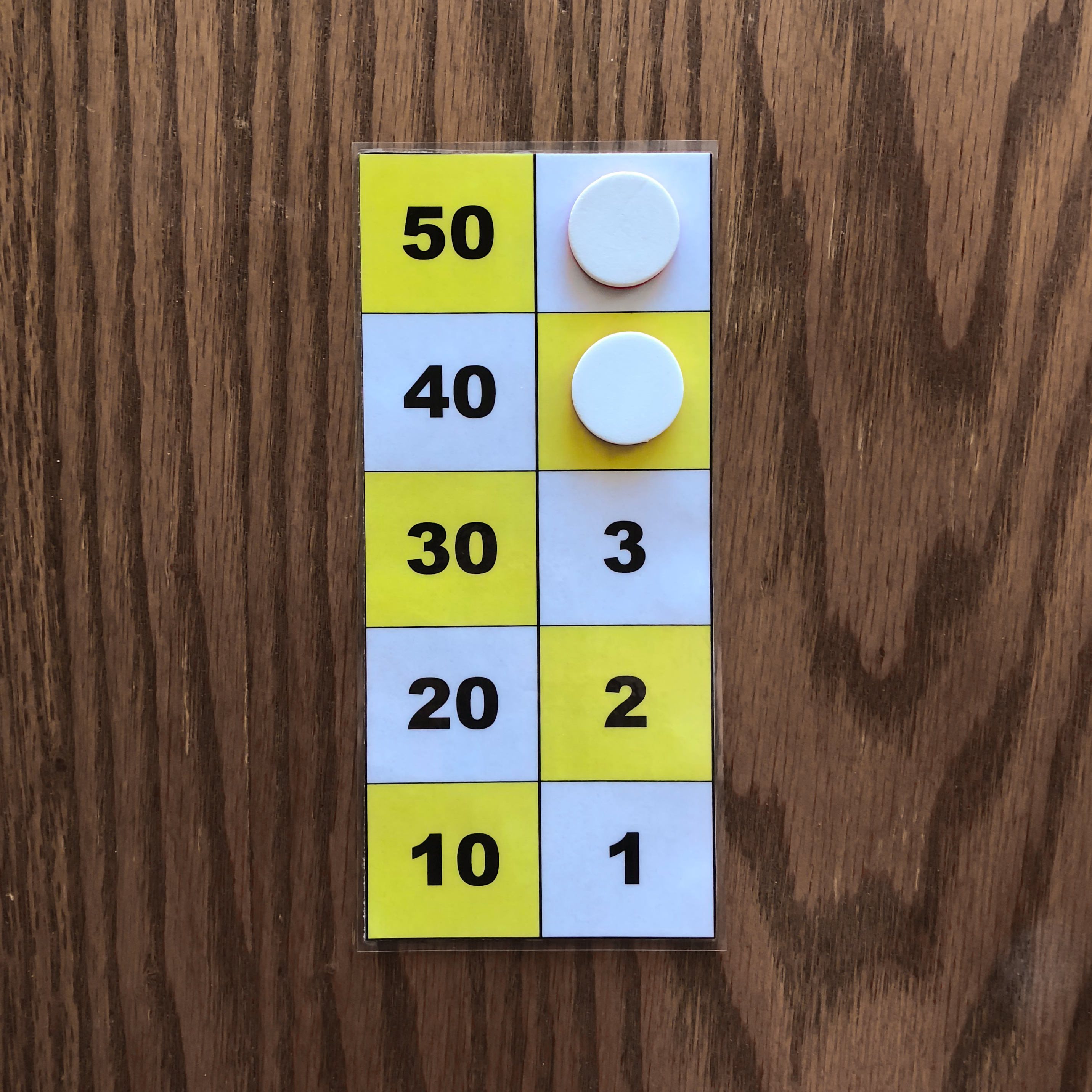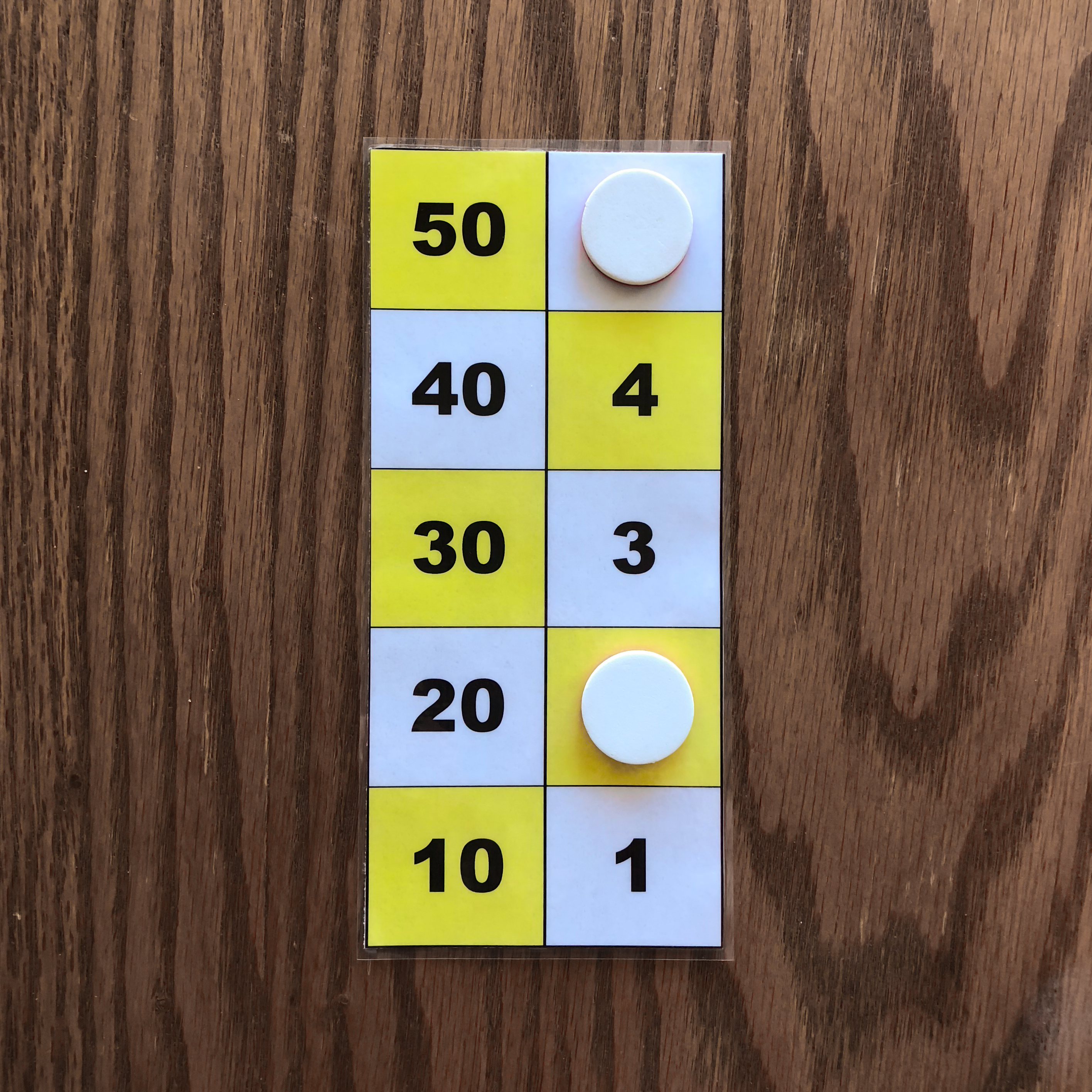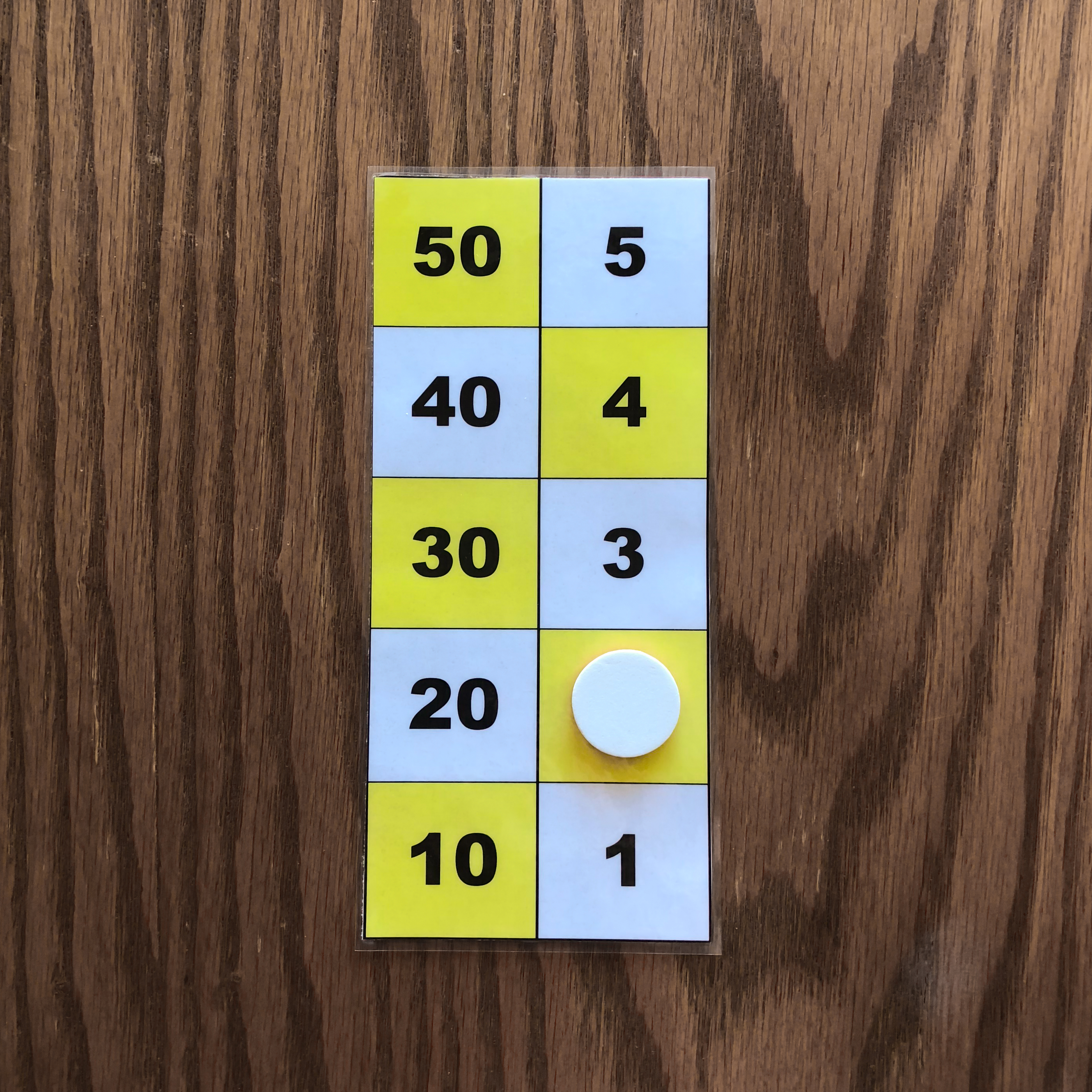 The leftmost and middle images show the number 47 represented on the board with three counters. These images depict the two ways to represent 47 on the board. The rightmost image shows the number 49 represented on the board with three counters. The number 49 cannot be represented in two ways with three counters because one counter must be placed on 40, while the other two counters must be placed on 4 and 5. All other representations of 49 on the board require more tokens. Task 2 Find all ways of representing the numbers one through five with one, two, or three counters. Again you may use only one color of tokens during this task. Example Answers One Counter Answers