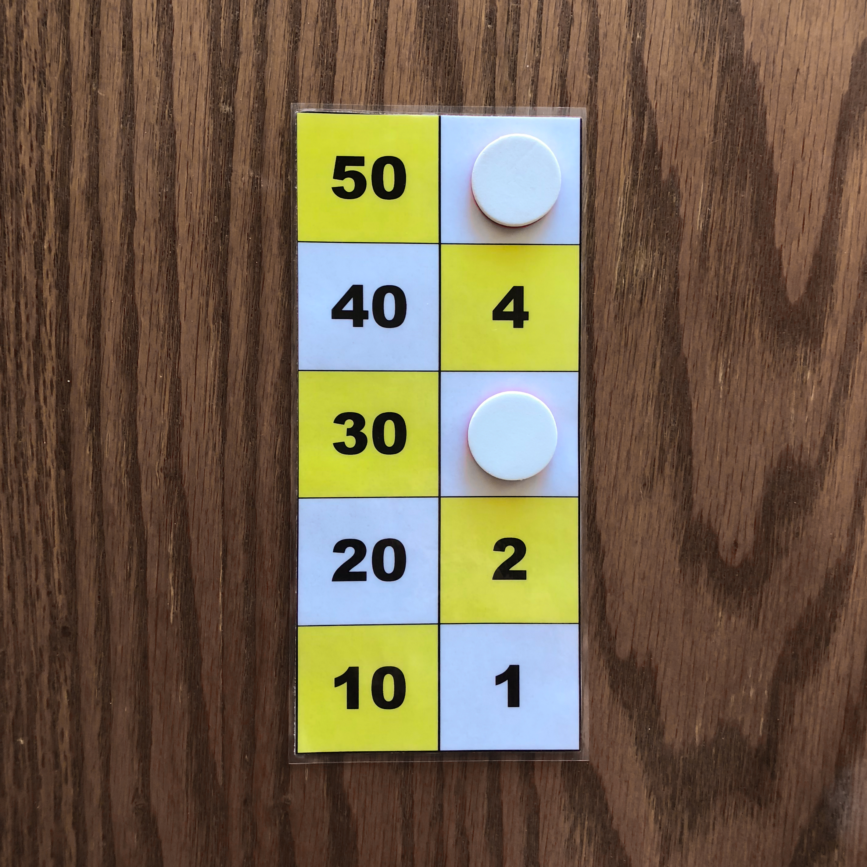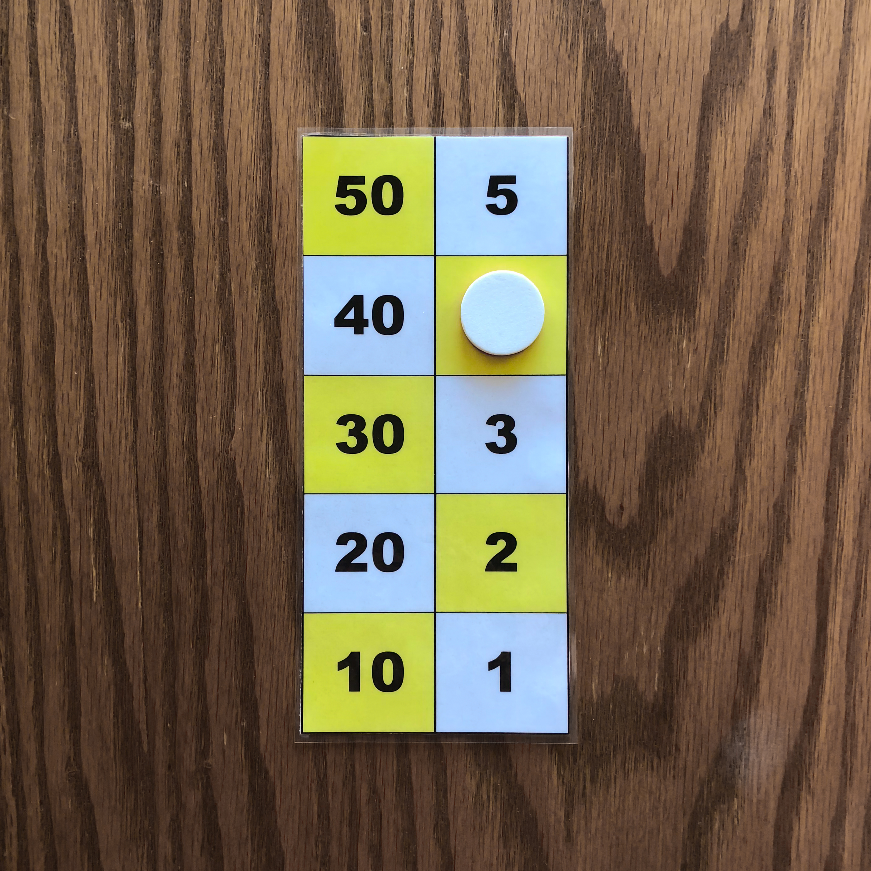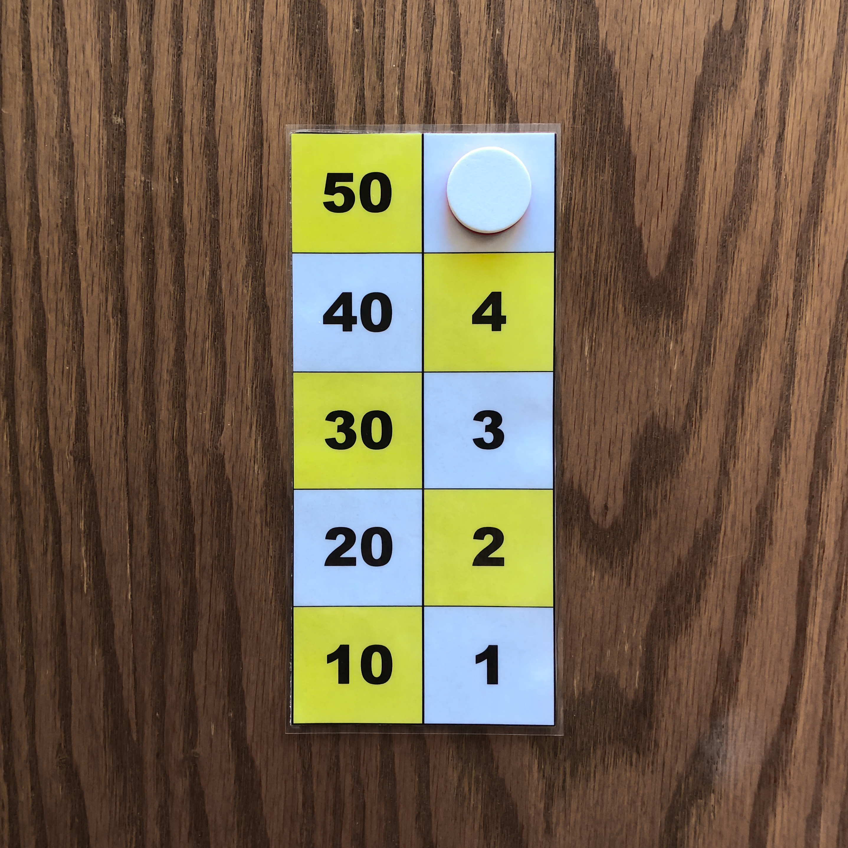The leftmost and middle images show the number 47 represented on the board with three counters. These images depict the two ways to represent 47 on the board. The rightmost image shows the number 49 represented on the board with three counters. The number 49 cannot be represented in two ways with three counters because one counter must be placed on 40, while the other two counters must be placed on 4 and 5. All other representations of 49 on the board require more tokens. Task 2 Find all ways of representing the numbers one through five with one, two, or three counters. Again you may use only one color of tokens during this task. Example Answers One Counter Answers