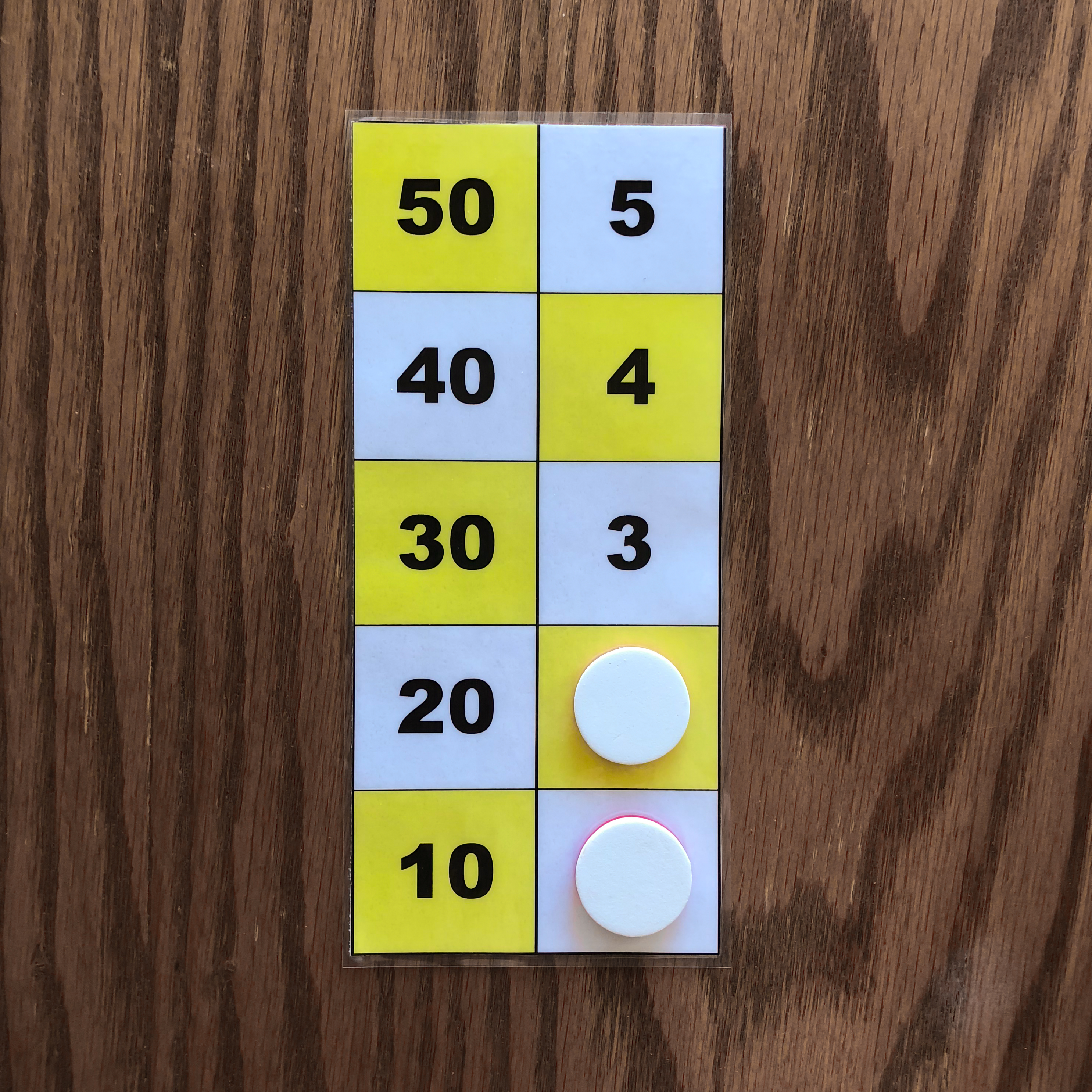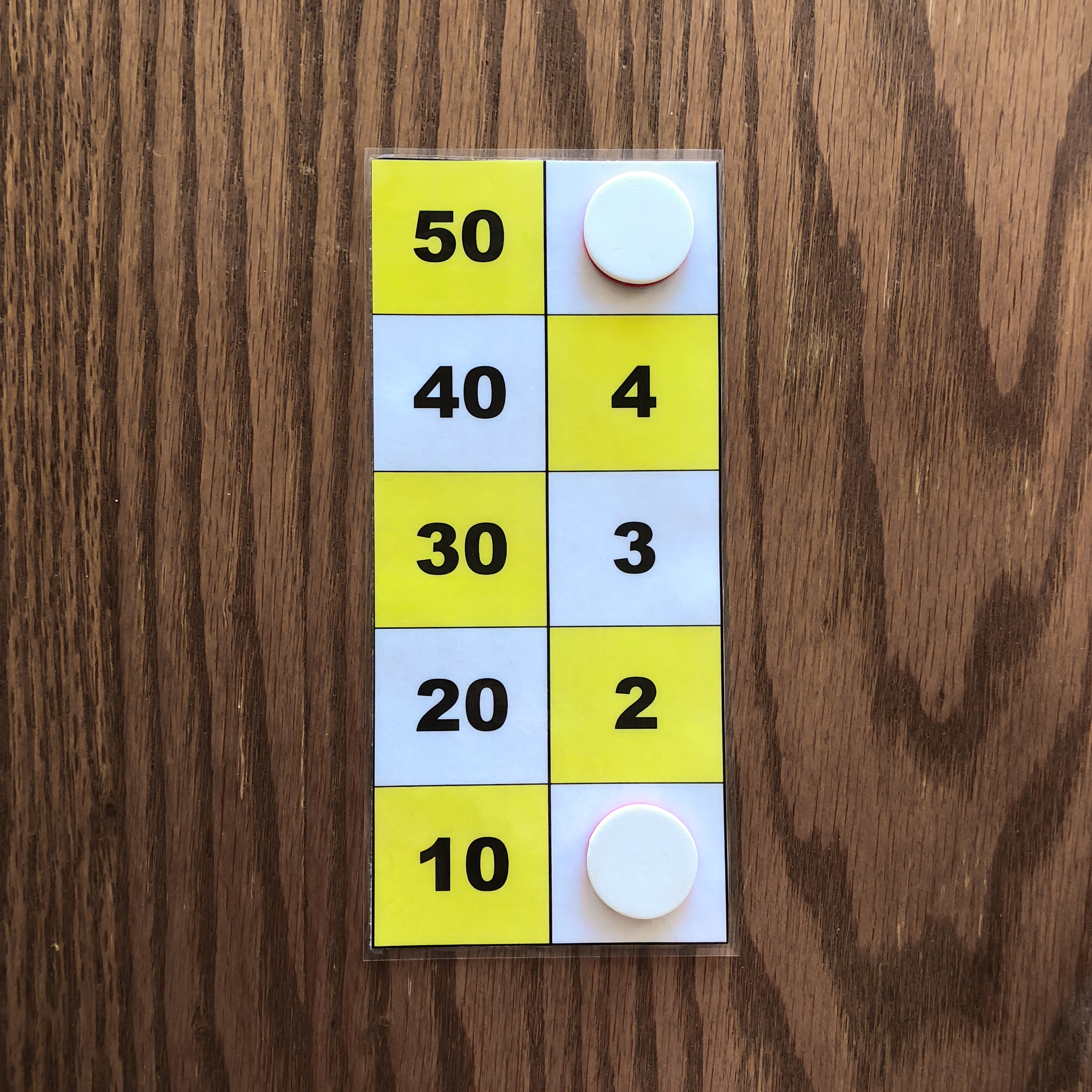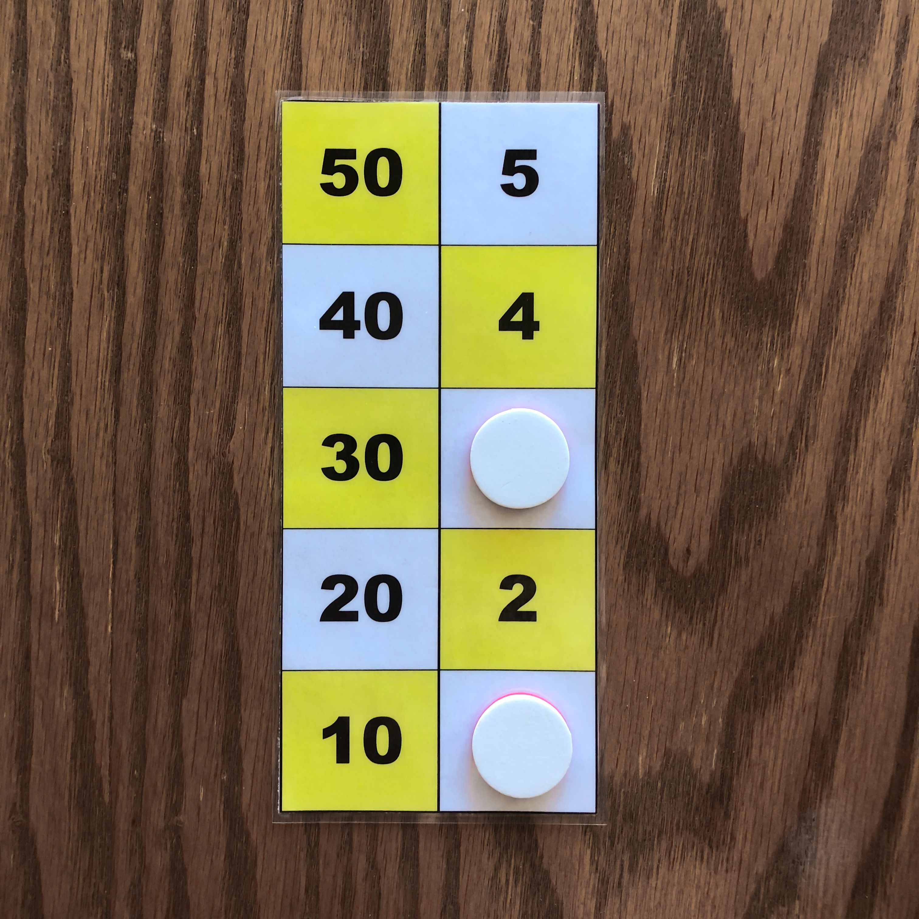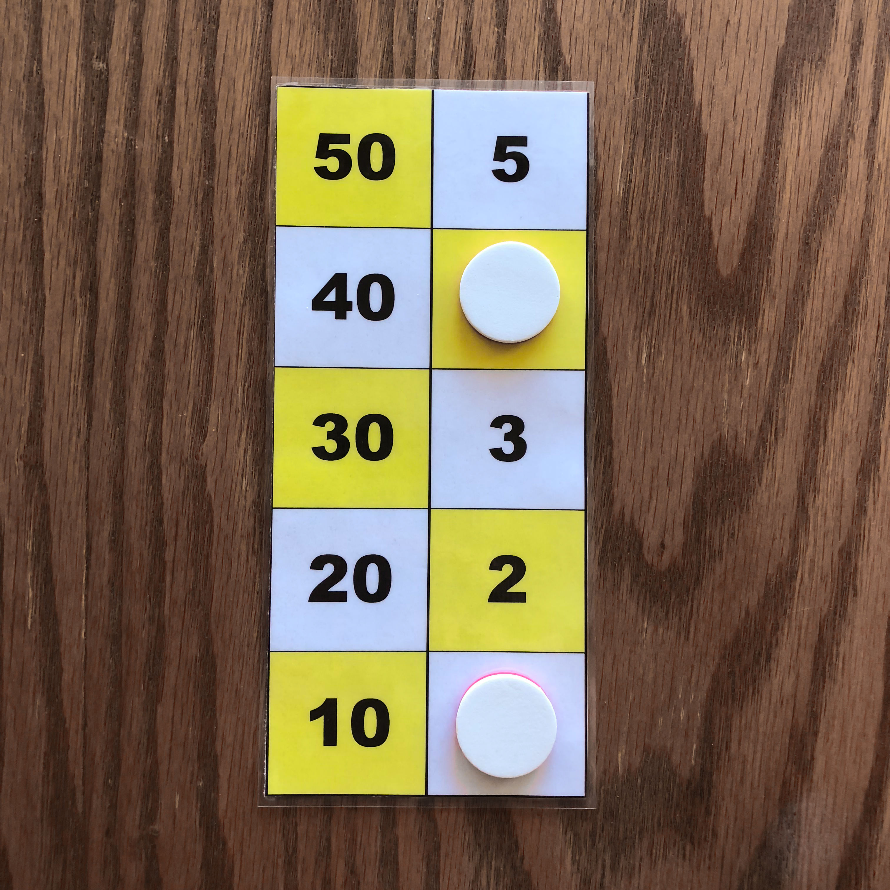 The leftmost and middle images show the number 47 represented on the board with three counters. These images depict the two ways to represent 47 on the board. The rightmost image shows the number 49 represented on the board with three counters. The number 49 cannot be represented in two ways with three counters because one counter must be placed on 40, while the other two counters must be placed on 4 and 5. All other representations of 49 on the board require more tokens. Task 2 Find all ways of representing the numbers one through five with one, two, or three counters. Again you may use only one color of tokens during this task. Example Answers One Counter Answers