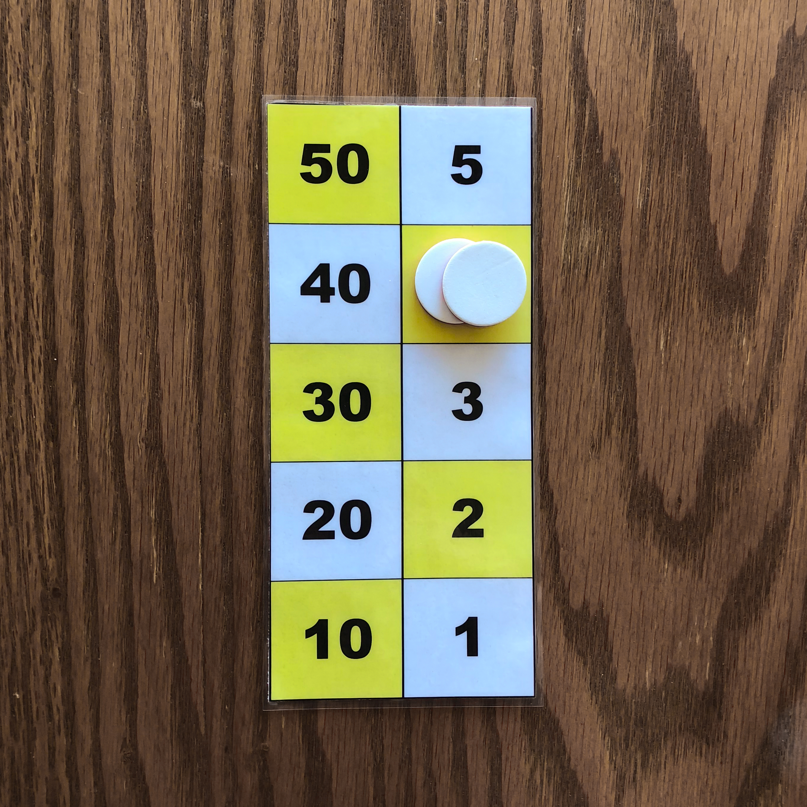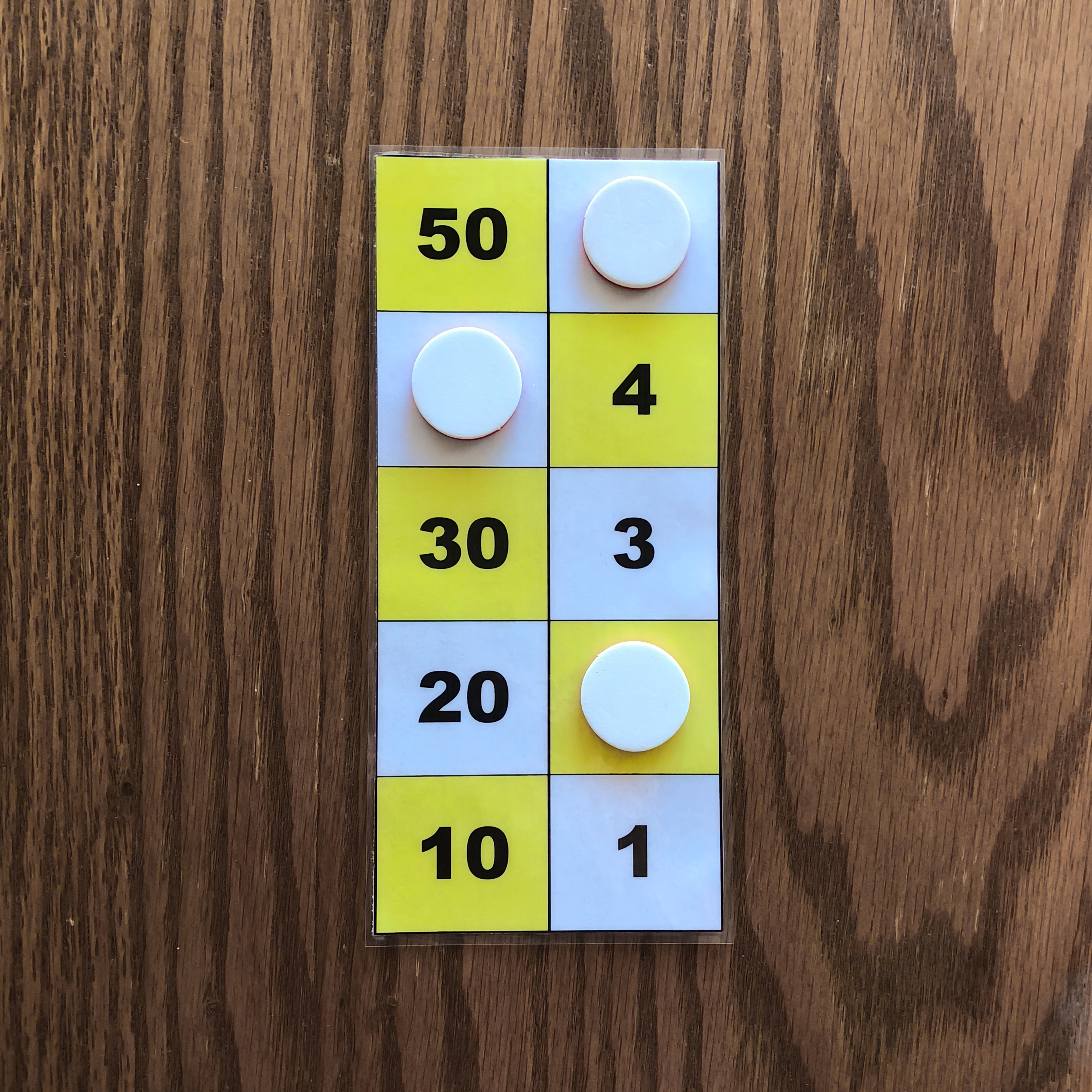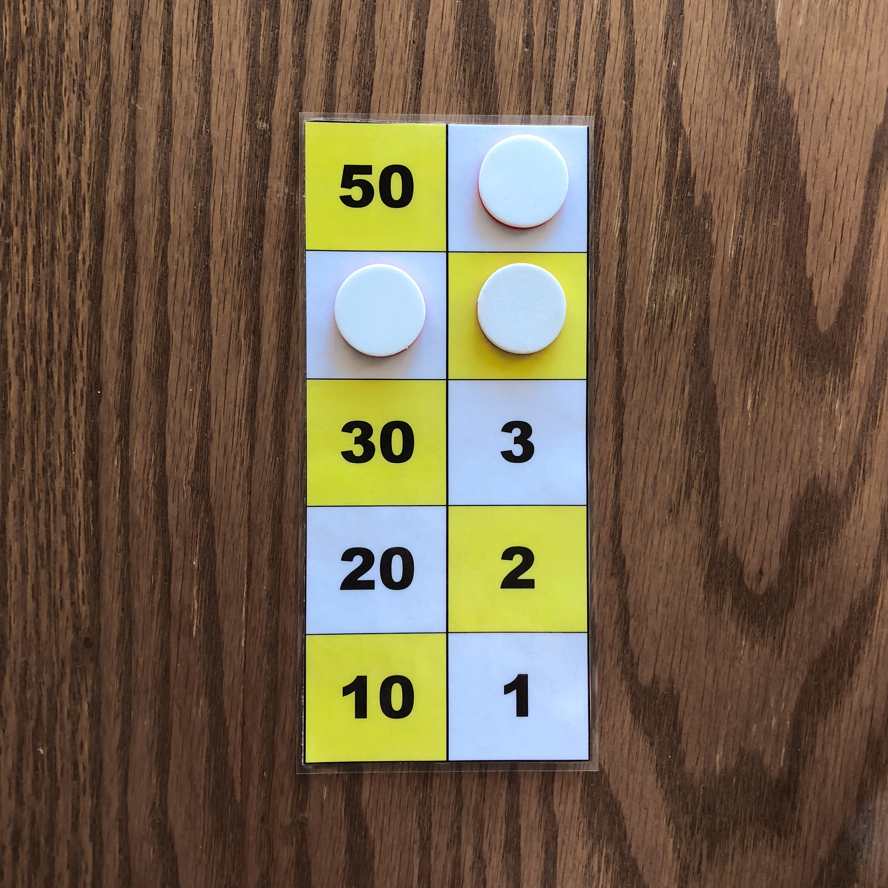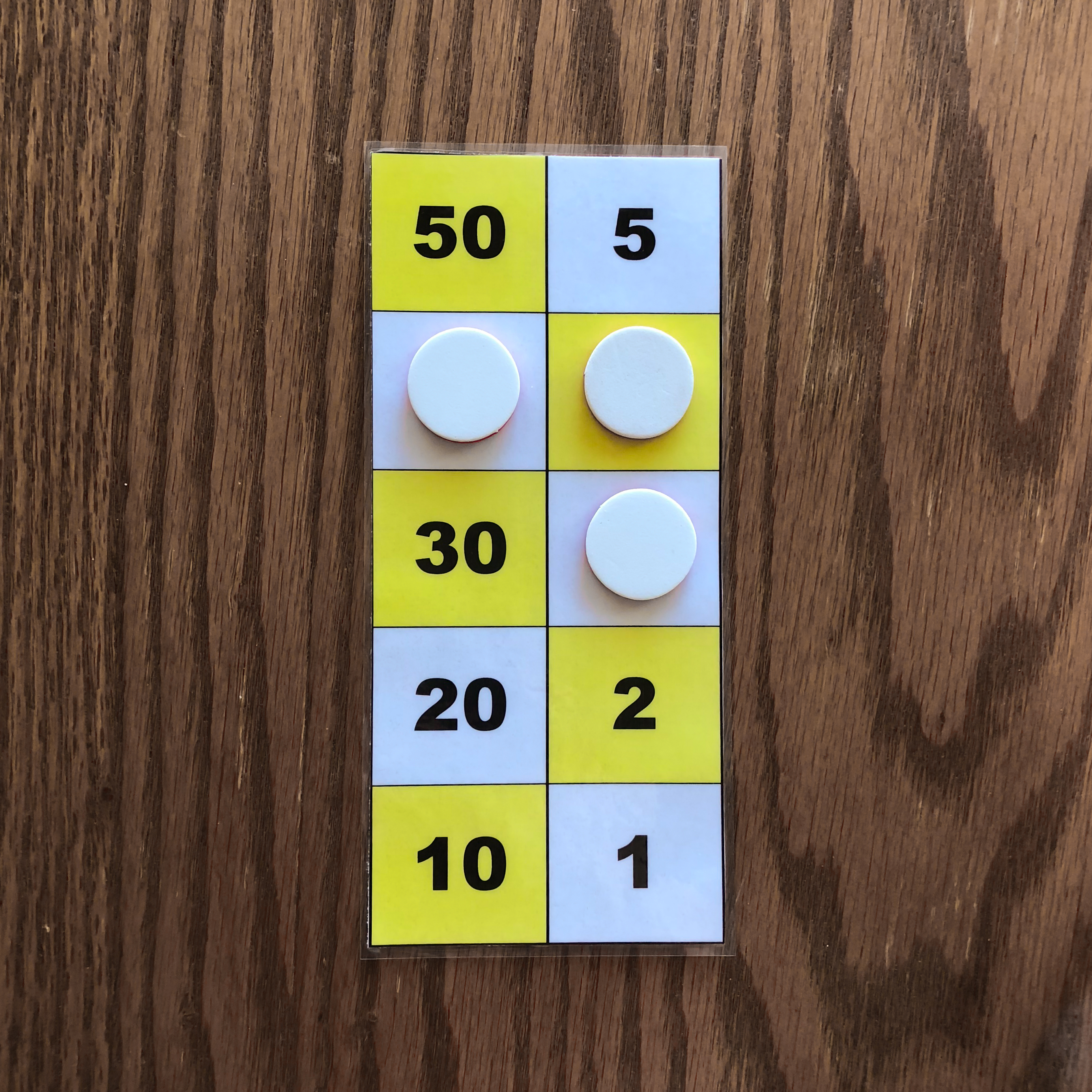 One counter on the 50 square, one counter on the 10 square, one counter on the 5 square, and one counter on the 1 square is one example of the number 66 represented on the board. 3. Representation of the numbers 1 to 5 with two or three counters.