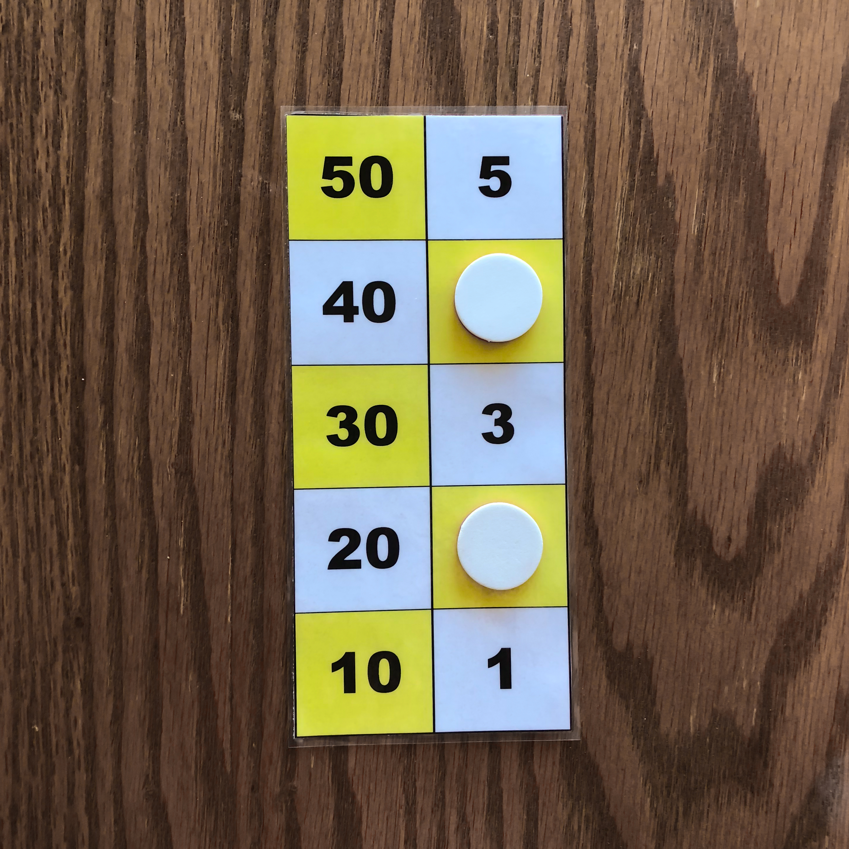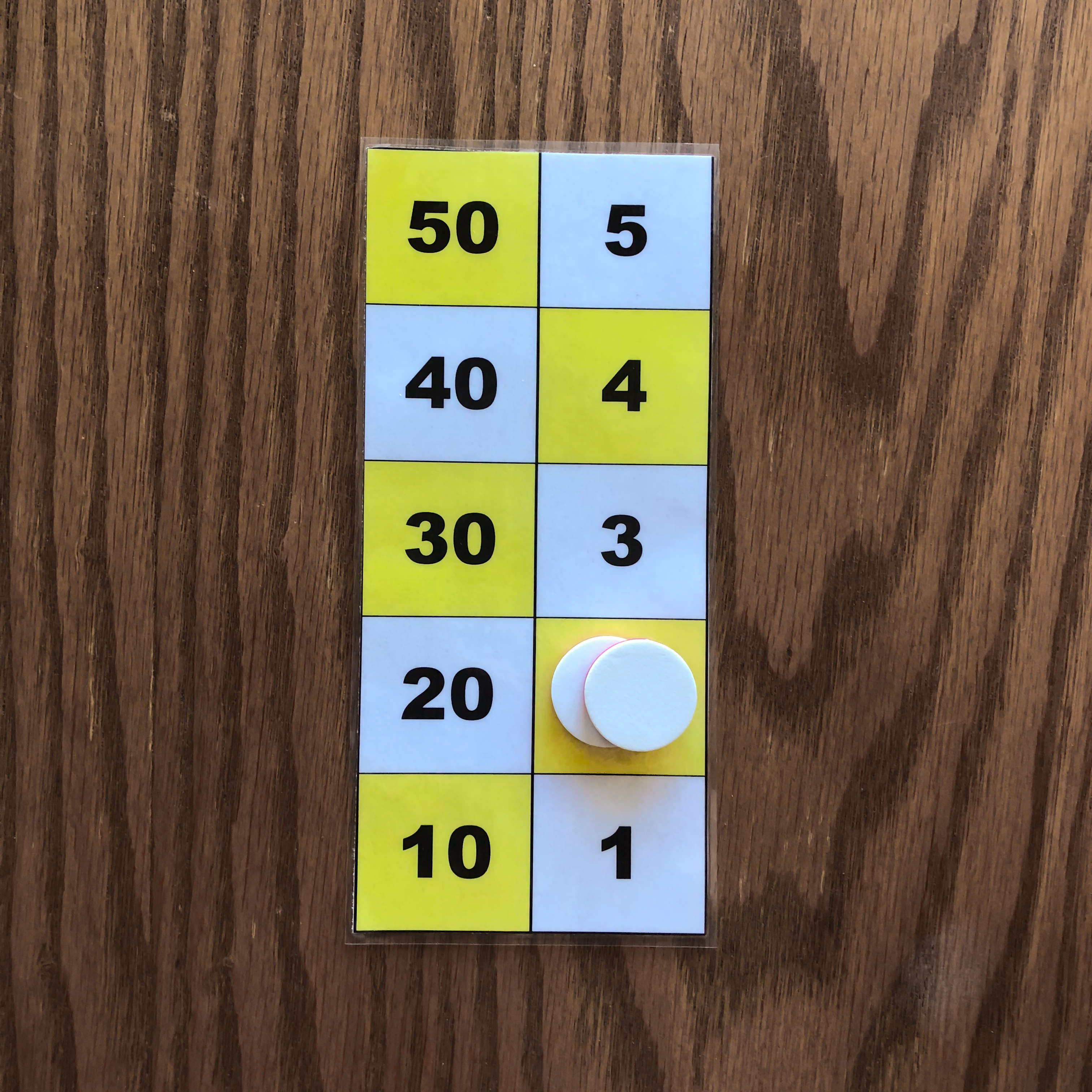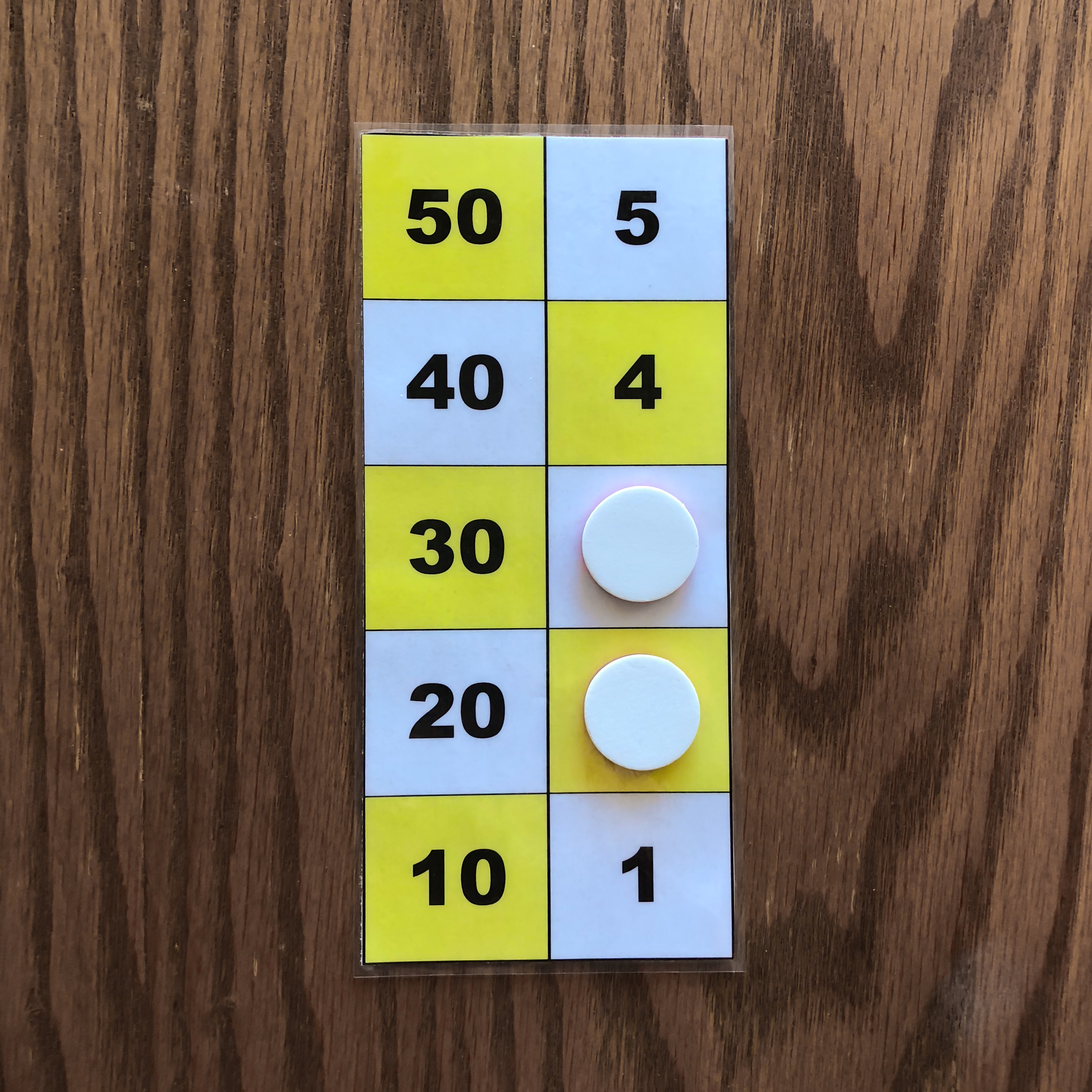 One counter on the 50 square, one counter on the 10 square, one counter on the 5 square, and one counter on the 1 square is one example of the number 66 represented on the board. 3. Representation of the numbers 1 to 5 with two or three counters.