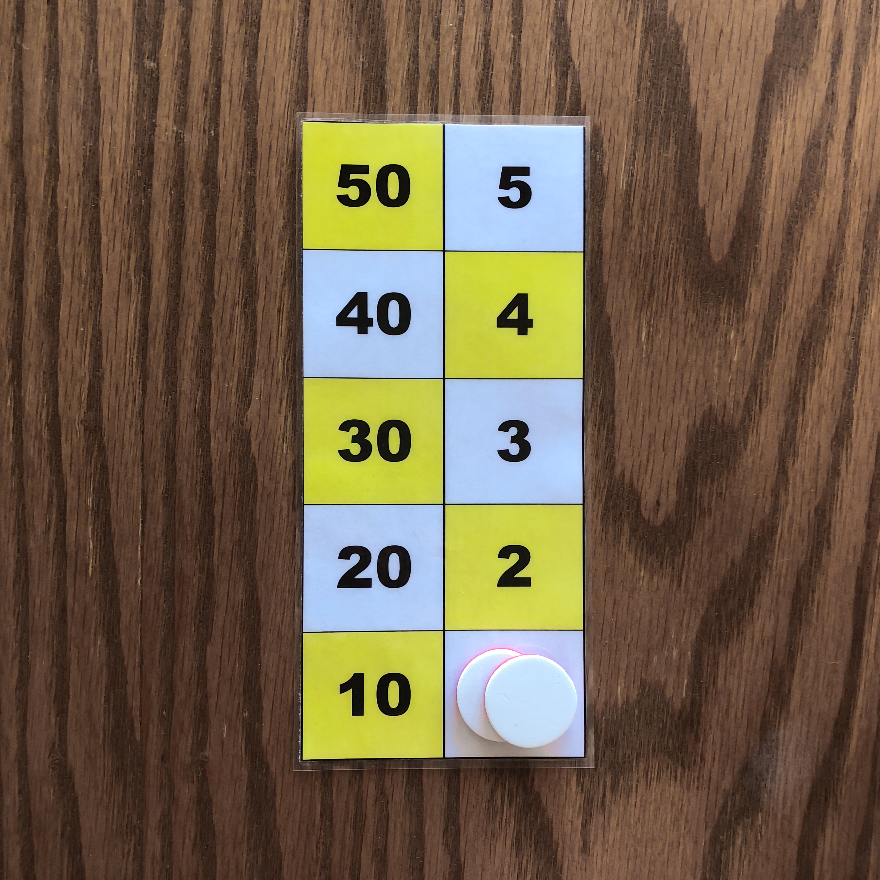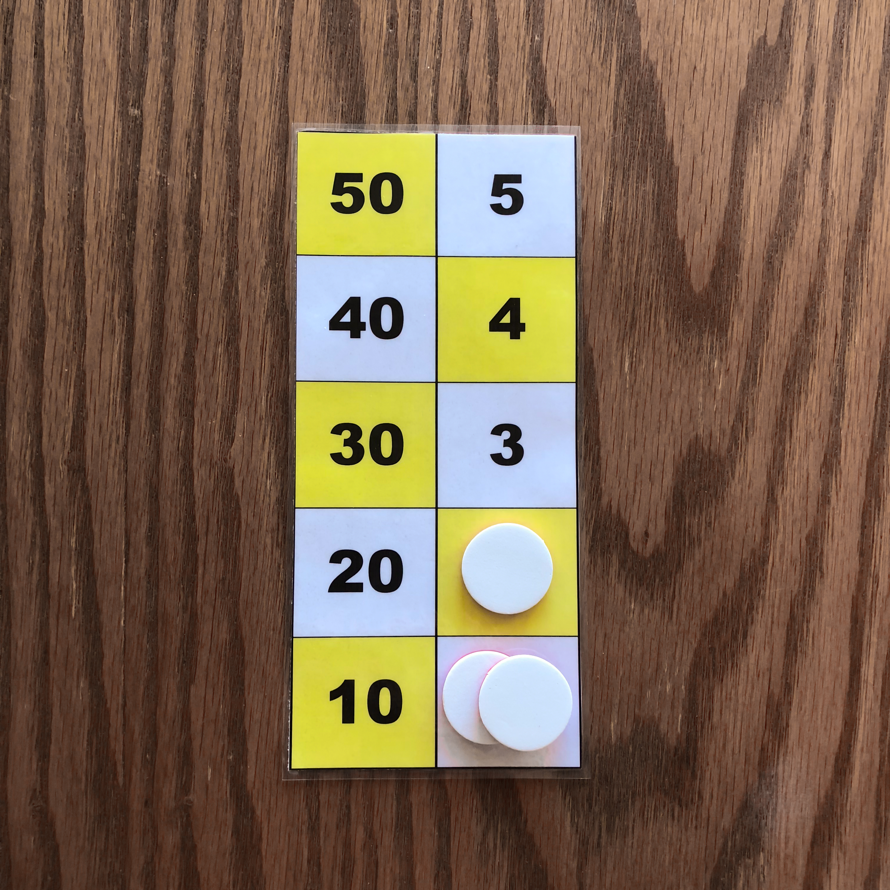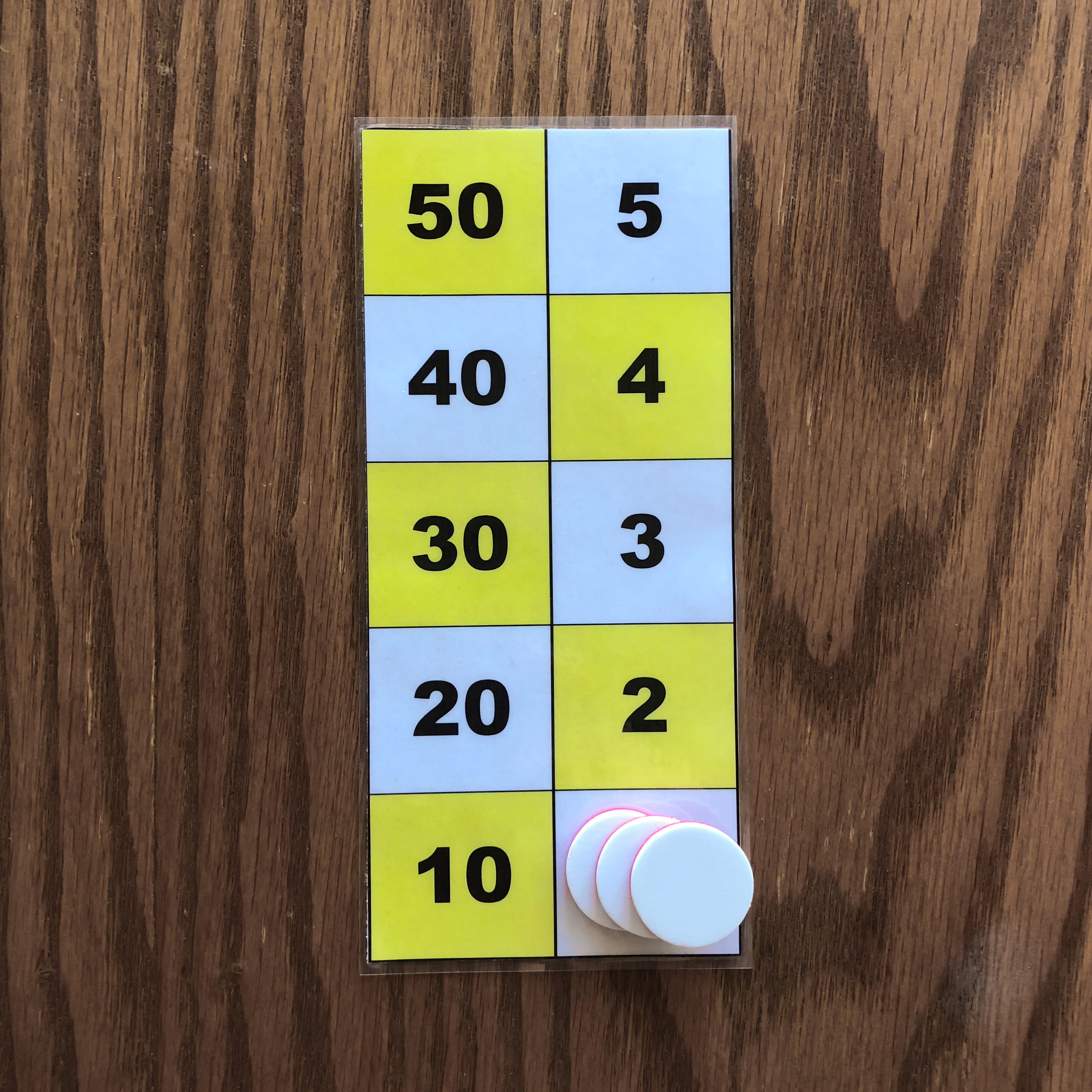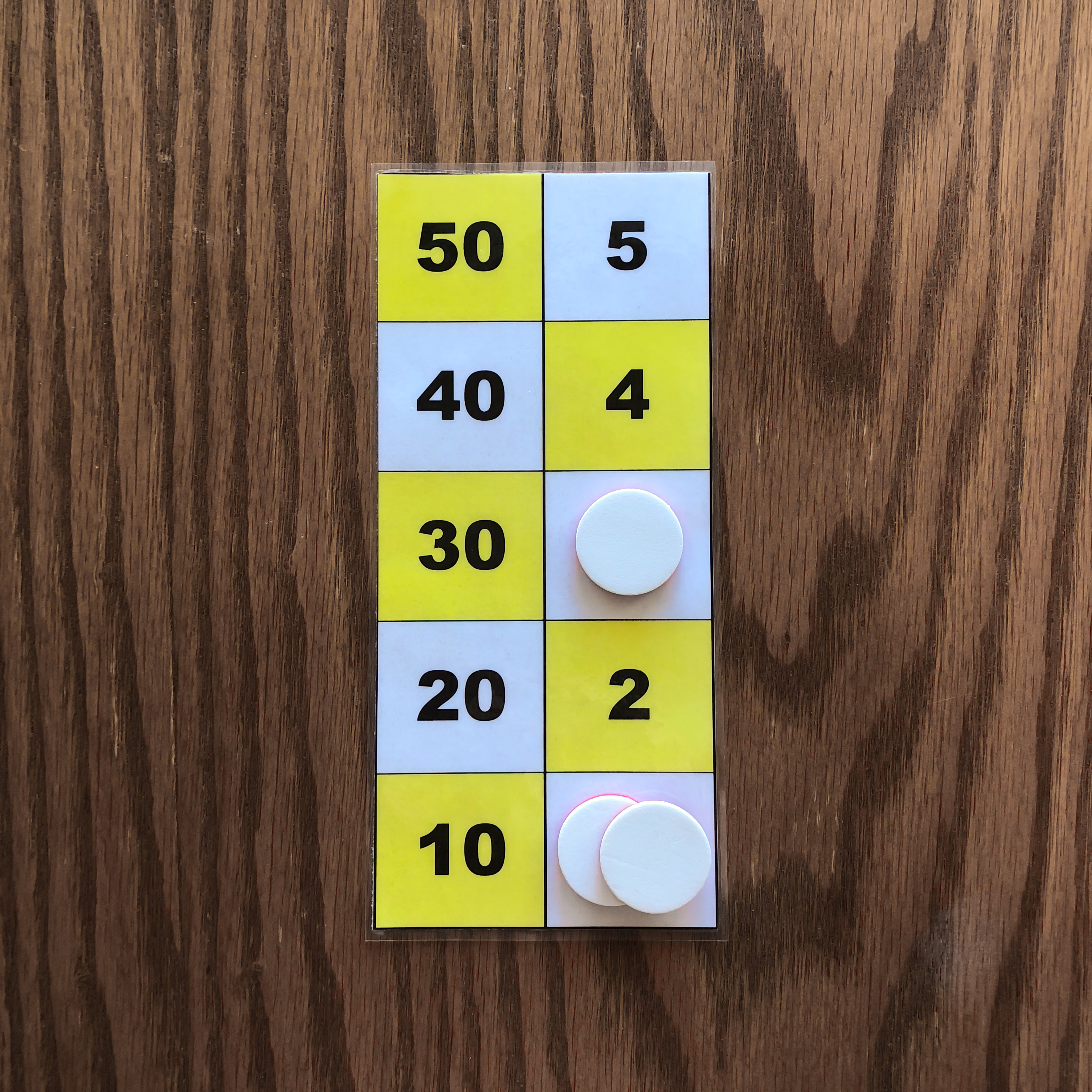 One counter on the 50 square, one counter on the 10 square, one counter on the 5 square, and one counter on the 1 square is one example of the number 66 represented on the board. 3. Representation of the numbers 1 to 5 with two or three counters.