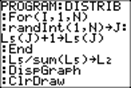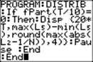 The program "DISTRIB" below simulates the toss of a 20-sided (icosahedral) die. Of course with 20 possible outcomes (the numbers 1 through 20) equally likely, each has a 5% probability of turning up. So the theoretical distribution will be a constant .05 for each outcome. What we want is to see how close to this distribution we can get by continually rolling the die over and over, in groups of 200 rolls. Each time we can look at the new distribution on the calculator screen. The program also tells us what the difference is in the number of tosses between the highest and lowest totals of tosses, and how far the current highest (or lowest) frequency of tosses is from the probability of .05 or 5%. If we stop the program, we can learn what the 20 actual frequencies are.