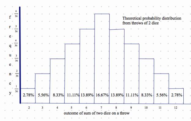 we computed the theoretical frequency distribution for throwing two dice. It looks like this: