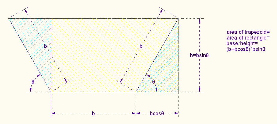 We see that the area of the rectangle is base*height. With a little trigonometry, we see that base*height is (b+b*cosθ)*b*sinθ=b2(1+cosθ)*sinθ=b2(sinθ+cosθ*sinθ)=f(θ).